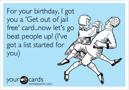 Source: www.someecards.com For Your Birthday, I Got You A 'Get Out Of Jail Free' Card...now Let's Go Beat People Up! %28I've Got A List Started For You%29 | Birthday Ecard