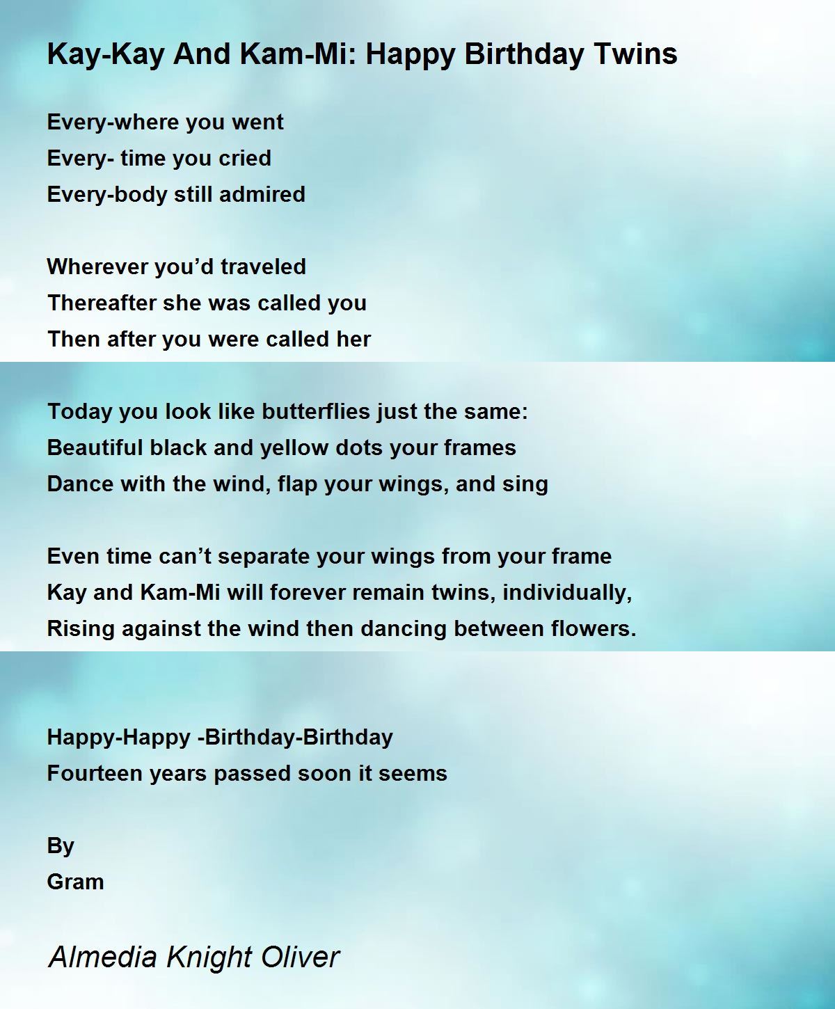 Source: www.poemhunter.com Kay-Kay And Kam-Mi: Happy Birthday Twins - Kay-Kay And Kam-Mi: Happy Birthday Twins Poem By Almedia Knight-Oliver